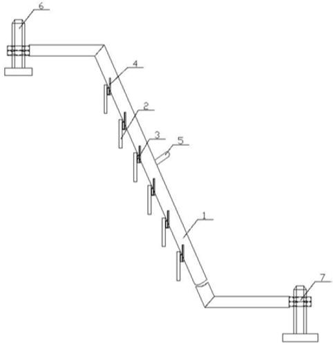這種裝置包括框架和擋板,所述框架由四對直桿焊接而成,所述四對直桿每對均平行分布,其 中和第二對直桿長度相等,且所述兩對直桿分別設置在框架的上下兩端,第三對直桿的兩端分別斜向焊接在和第二對直桿的一端上,所述和第二對直桿的另一端分別連接第四對直桿,所述第四對直桿分別首位焊接在和第二對直桿上;所述第三對直桿的內側焊接有連接板,所述連接板下端焊接有加固板,所述加固板的一側焊接在擋板的上端。